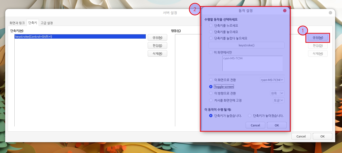 - 전 동작 설정의 옵션에서 Toggle Screen을 선택하겠습니다.