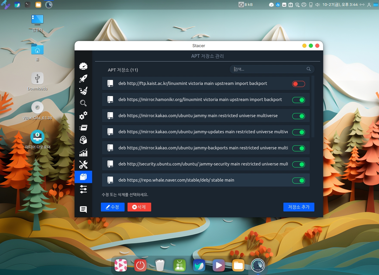 패키지 저장소를 편집할 수 있습니다. 활성, 비활성 또는 삭제가 가능합니다.