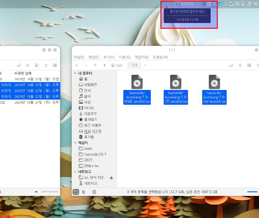 마우스를 동기화Sync 아이콘에 올려놓으면 진행상태를 확인할 수 있으며, 0KB로 표시되어야 파일 복사가 완료된것입니다.&#x20;