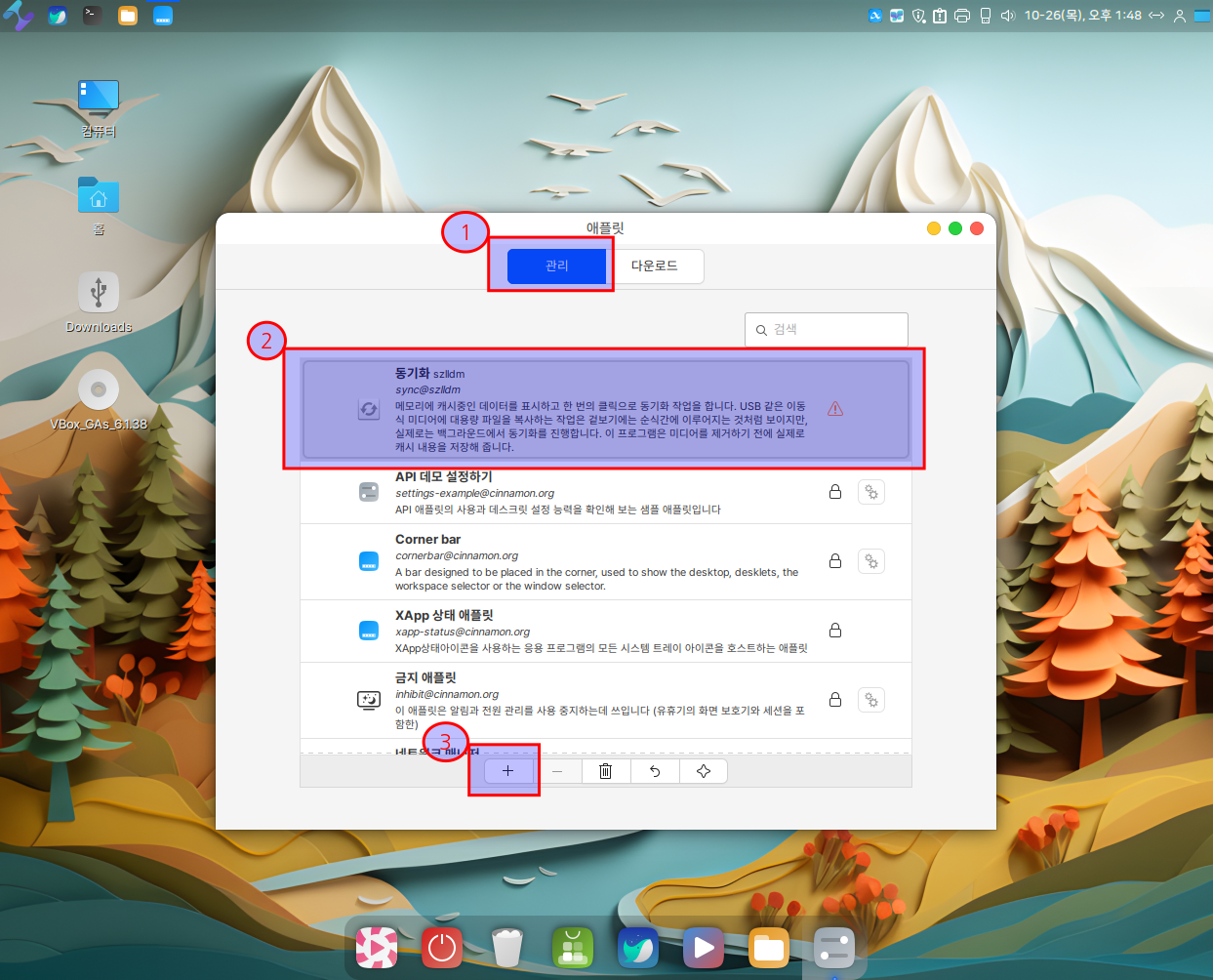 2. 애플릿 창에서 "관리" 탭을 클릭하고,  "동기화Sync" 애플릿을 사용하기 위해서 마우스로 선택을  하신 다음에 애플릿 창 하단의 "+"을 클릭합니다.&#x20;