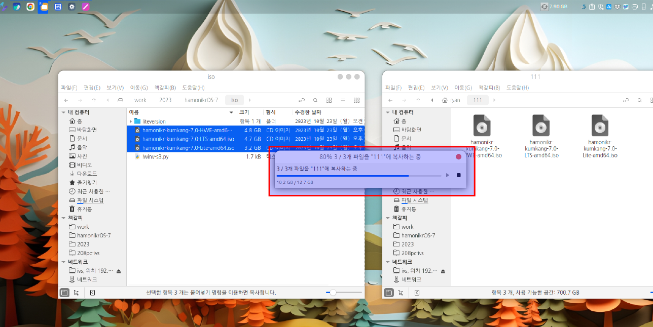 대용량 파일을 복사할때 아래 그림과 같이 파일 복사가 진행중인 상태창이 보여집니다.&#x20;