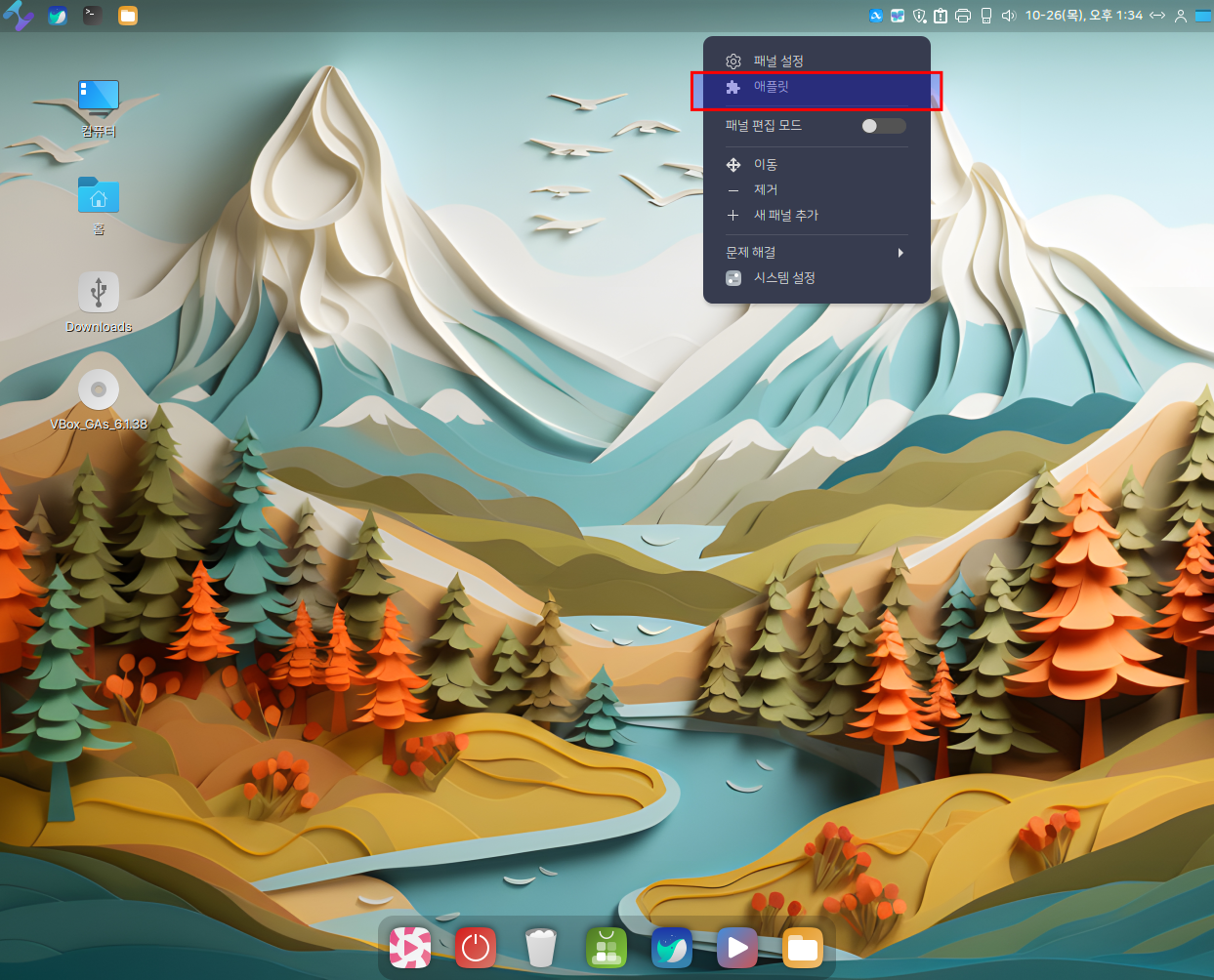 1. 작업 표시줄에서 마우스 우측 버튼을 클릭하여 애플릿을 선택합니다.&#x20;