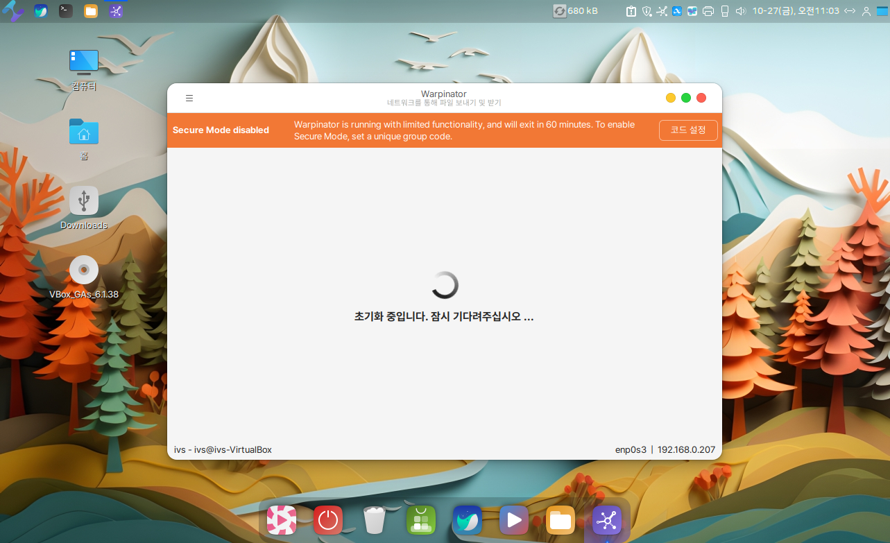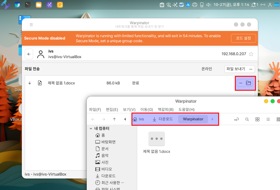 파일 전송이 완료되면 해당 파일의 위치는 "다운로드 > Warpinator"에 저장 됩니다.