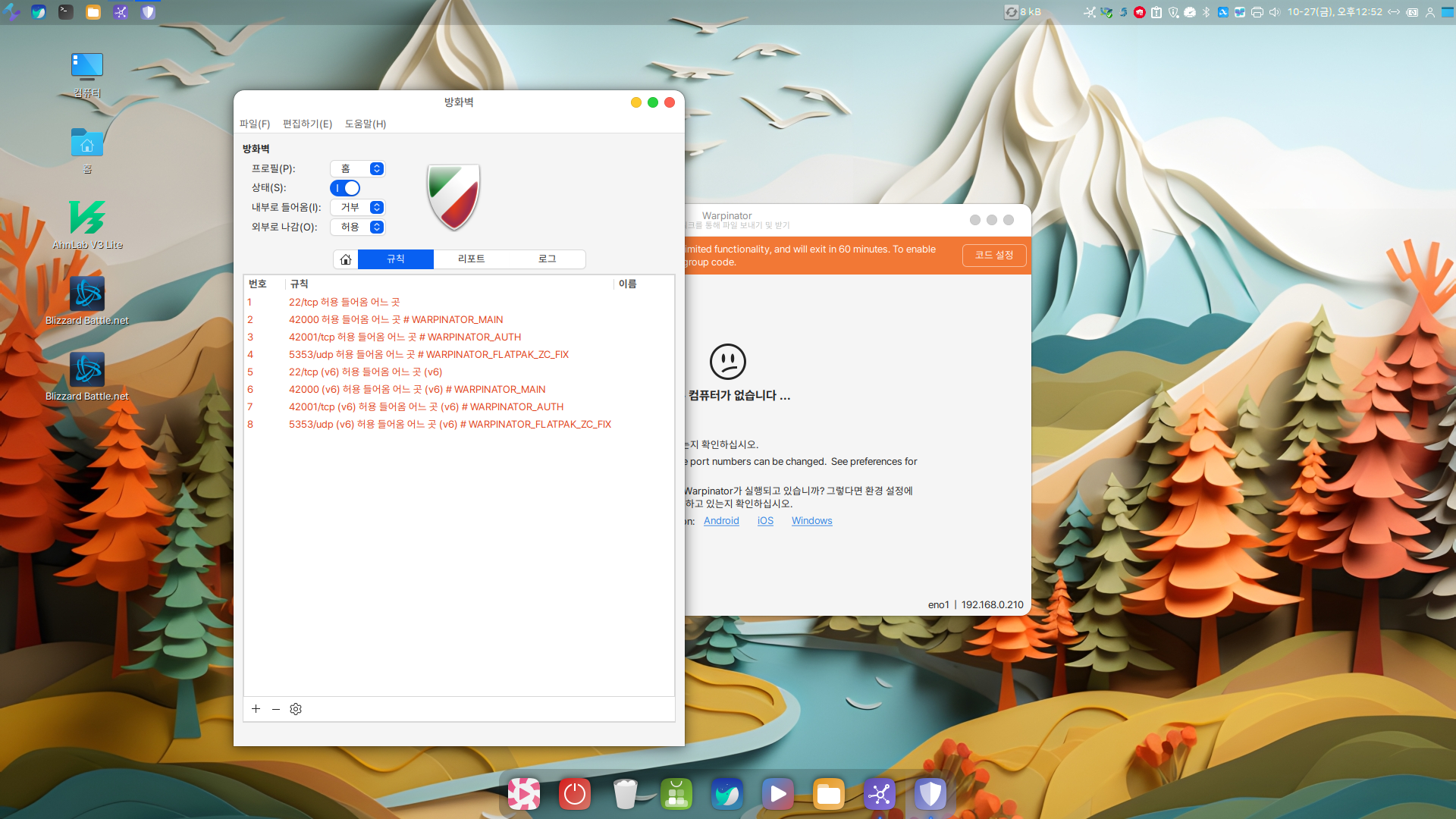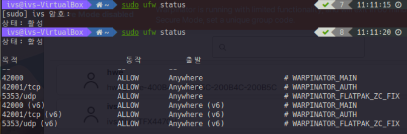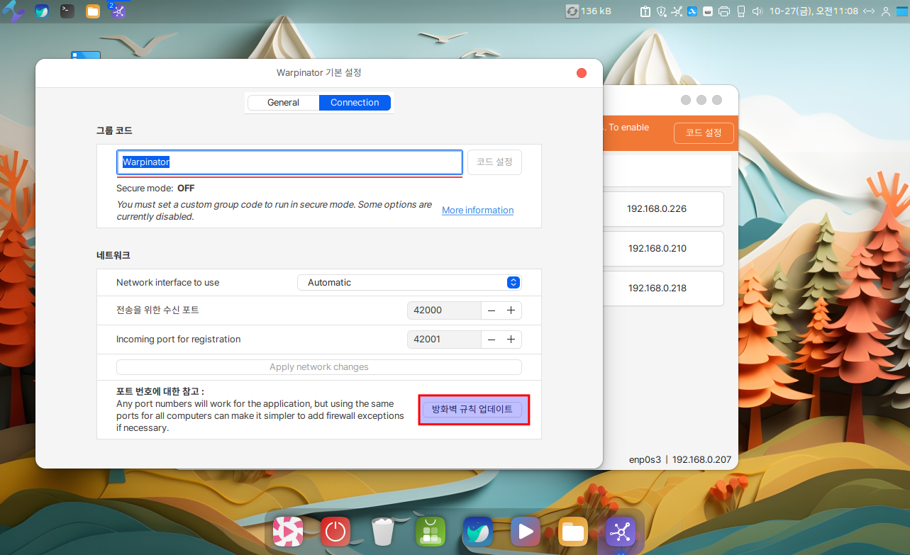기기간 파일 전송(Warpinator)의 기본 설정 창에서 하단의 방화벽 규칙 업데이트 버튼을 클릭합니다.