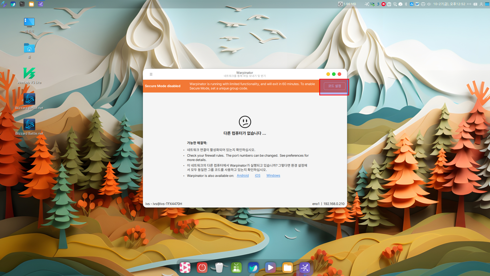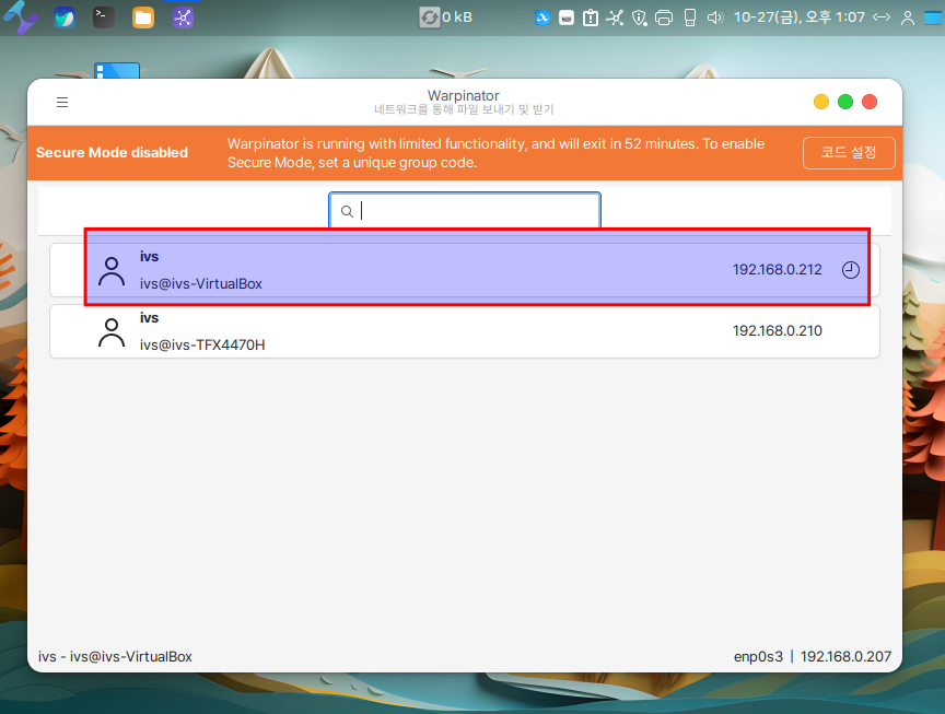 중요!. 만약 해당 컴퓨터에 방화벽이 실행되고 있다면, 기기간 파일 전송(Warpinator) 창에서 "코드 설정" 버튼을 클릭합니다.