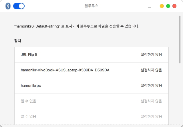 블루투스 프로그램에 접속하면 연결할 수 있는 장치 목록이 보여지고, 화면 상단의 버튼을 통해 블루투스를 키거나 끌 있습니다.