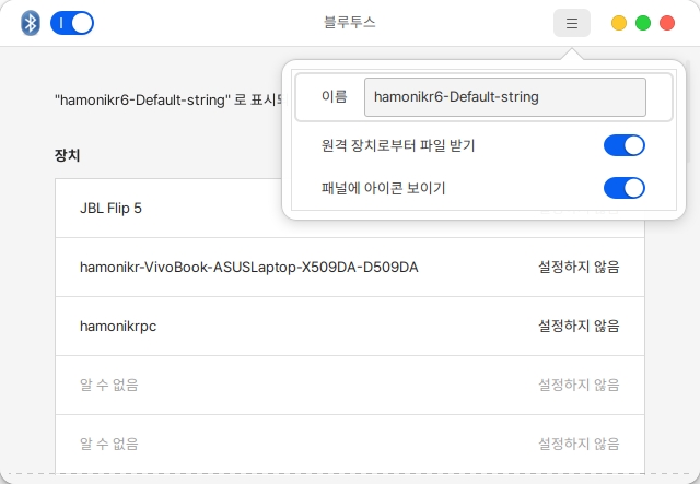 상단의 아이콘을 클릭하면 이름 변경이 가능하고, 원격 장치로부터 파일 받기와 아이콘 보이기 여부를 설정할 수 있습니다.