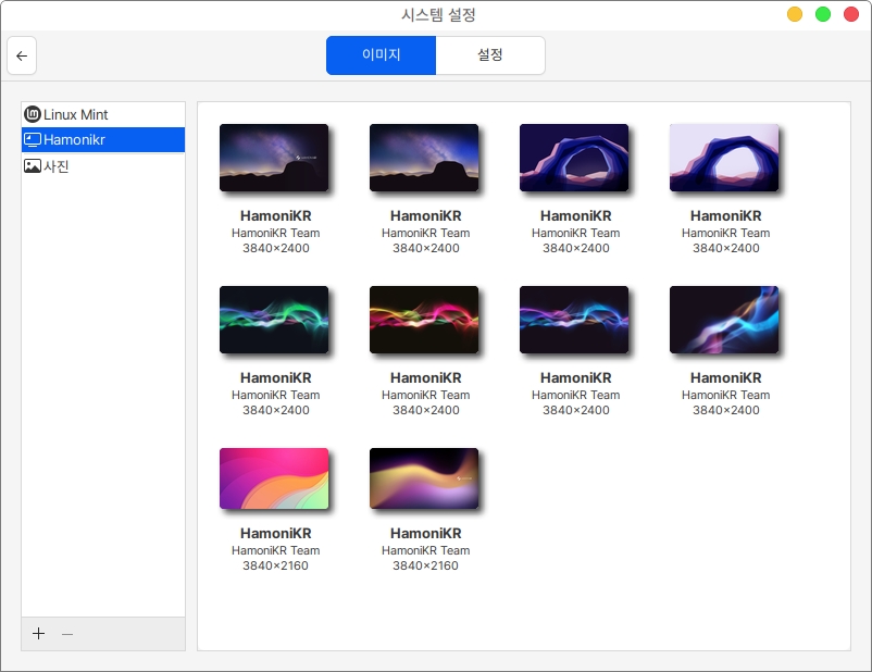 이미지 항목에서는 배경화면 이미지의 변경이 가능합니다. 사진 폴더에 이미지를 넣으면 배경화면 선택화면의 사진 폴더에 해당 이미지가 나타납니다. 하단의 아이콘을 통해 폴더를 추가하거나 제거할 수 있습니다.