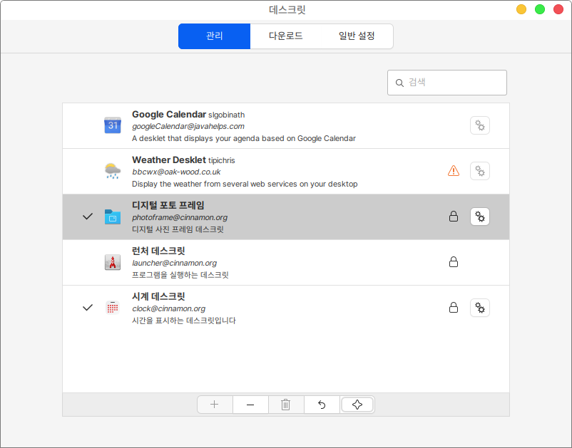 2\. 관리 매뉴에서 다운로드 받아진 어플리케이션을 선택하고 하단의 + 버튼을 통해 바탕화면에 데스크릿을 추가한다. ( 바탕화면에서 제거하고싶은 어플리케이션은 어플리케이션 선택 후 - 버튼을 클릭합니다.)&#x20;