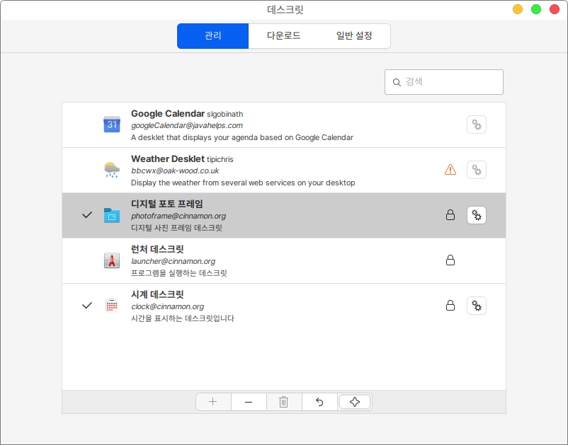 2. 관리 매뉴에서 다운로드 받아진 어플리케이션을 선택하고 하단의 + 버튼을 통해 바탕화면에 데스크릿을 추가한다. ( 바탕화면에서 제거하고싶은 어플리케이션은 어플리케이션 선택 후 - 버튼을 클릭합니다.)