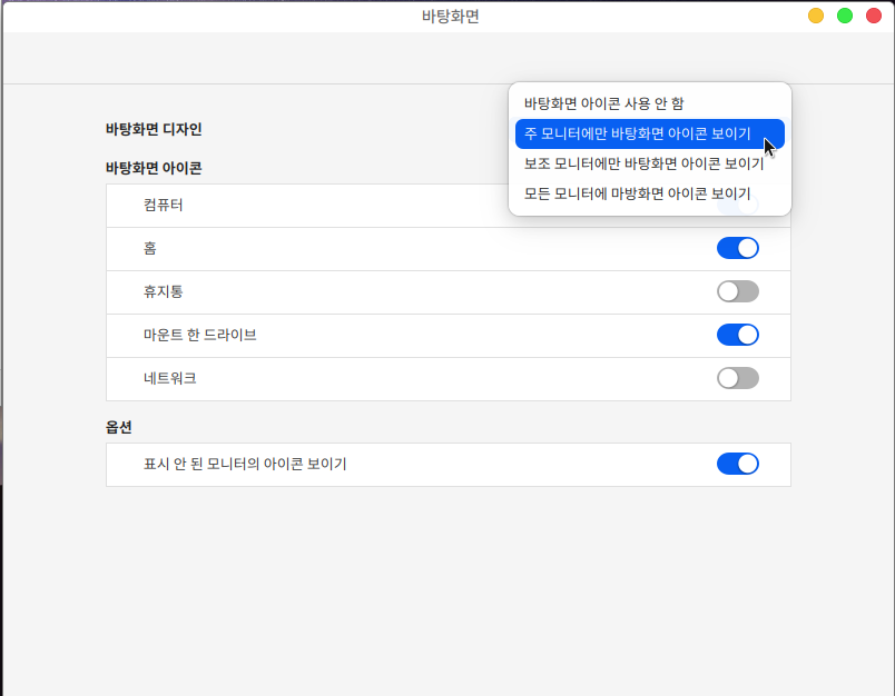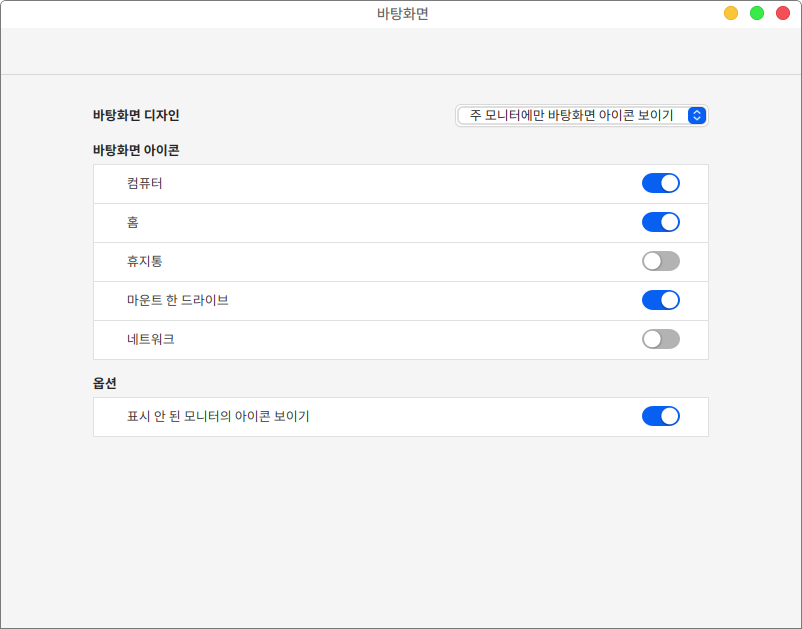 바탕화면 디자인을 통해 바탕화면 아이콘이 보여지는 공간 선택과, 바탕화면에 보여지는 아이콘을 선택할 수 있습니다.