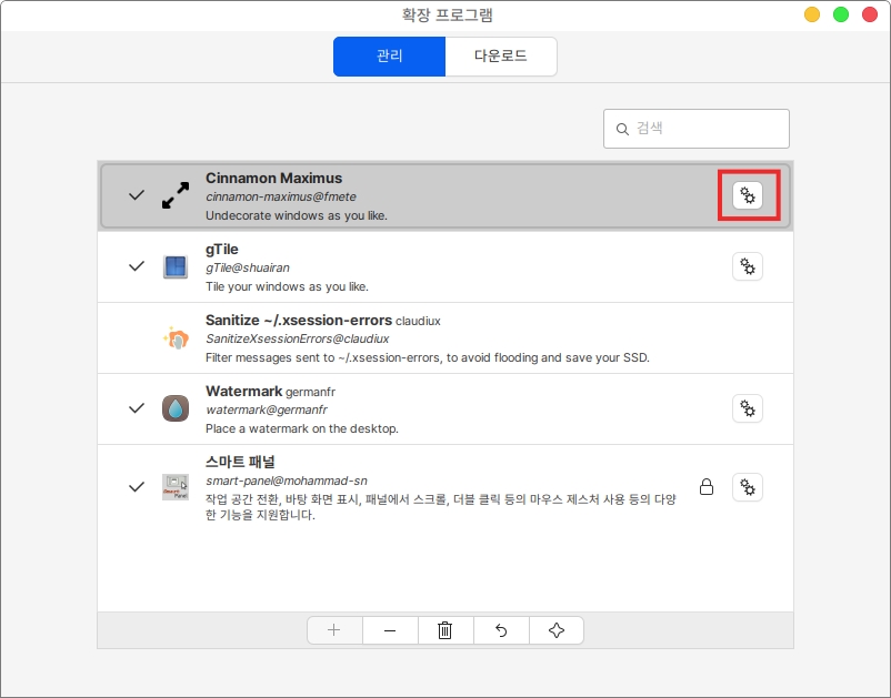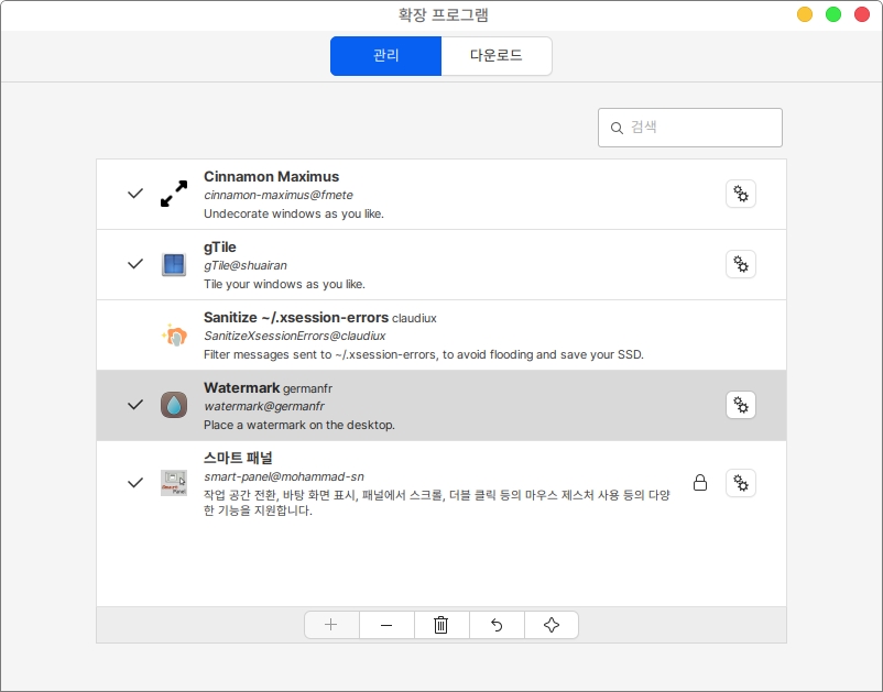 2. 관리 메뉴에서 다운로드 받아진 확장 프로그램을 선택하고 하단의 + 버튼을 통해 확장 프로그램을 설치할 수 있습니다. (제거하고싶은 확장 프로그램은 선택 후 - 아이콘을 클릭합니다.)