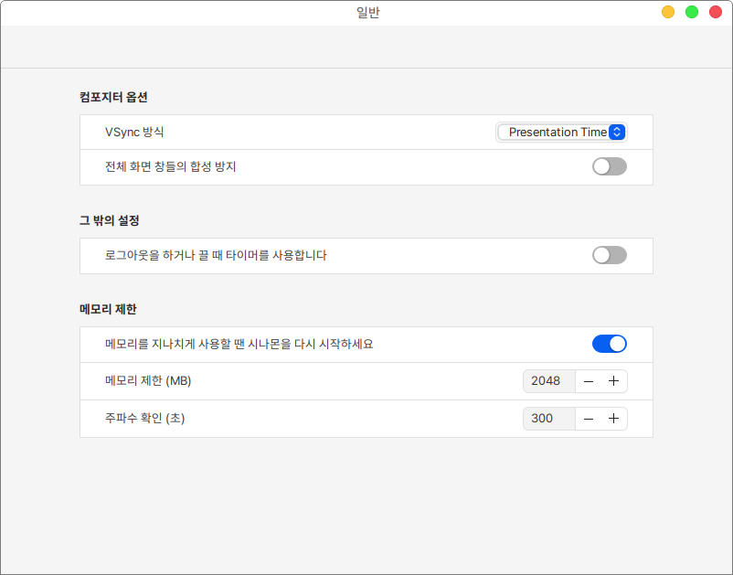 일반을 통해 컴포지터 옵션, 로그아웃과 컴퓨터 종료 시 타이머 여부, 메모리 제한 설정을 할 수 있습니다.