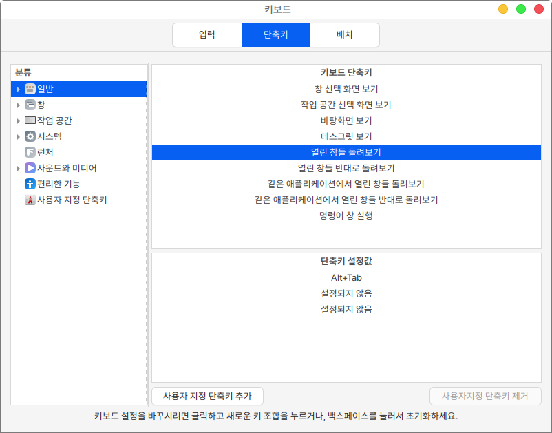 단축키 항목에서는 분류에 따라 단축키를 추가하거나 제거할 수 있습니다.