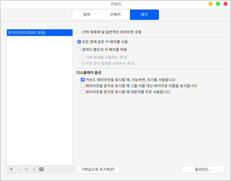 배치 항목에서는 키보드 배치와 디스플레이 옵션 설정을 할 수 있습니다.