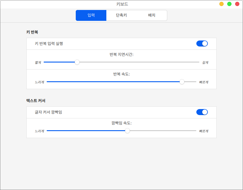 입력 항목을 통해 키 반복 설정과 텍스트 커서 깜빡임 속도 설정을 할 수 있습니다. &#x20;