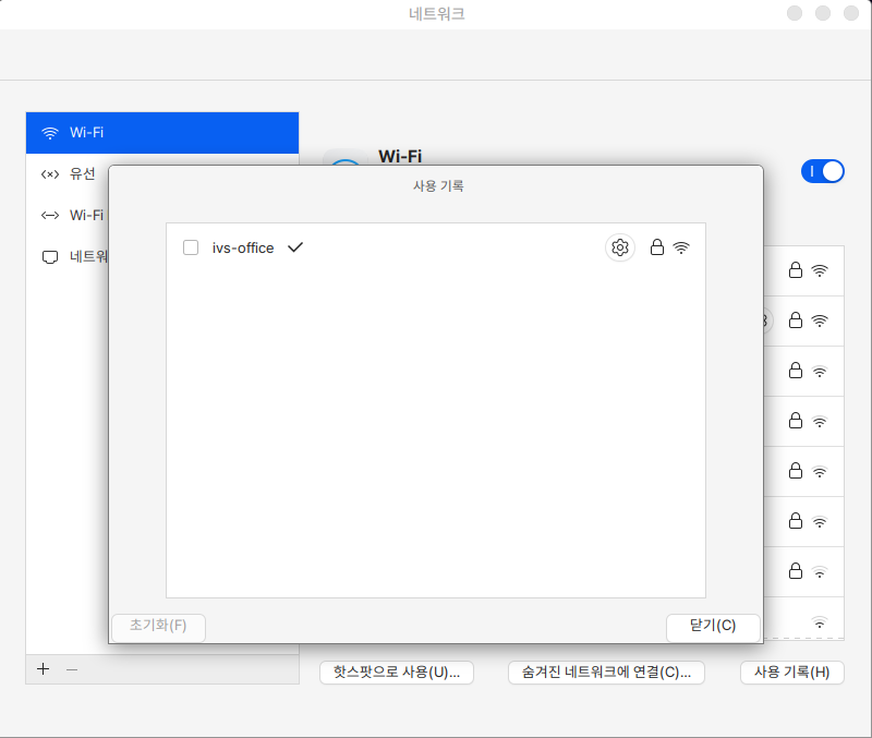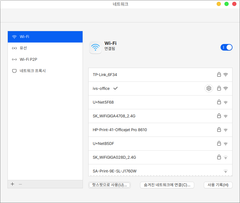 무선 인터넷을 연결하면 좌측 사이드바에 Wi-Fi 항목이 보여지고, 연결 가능한 와이파이 목록과 와이파이 사용기록을 확인할 수 있습니다.&#x20;