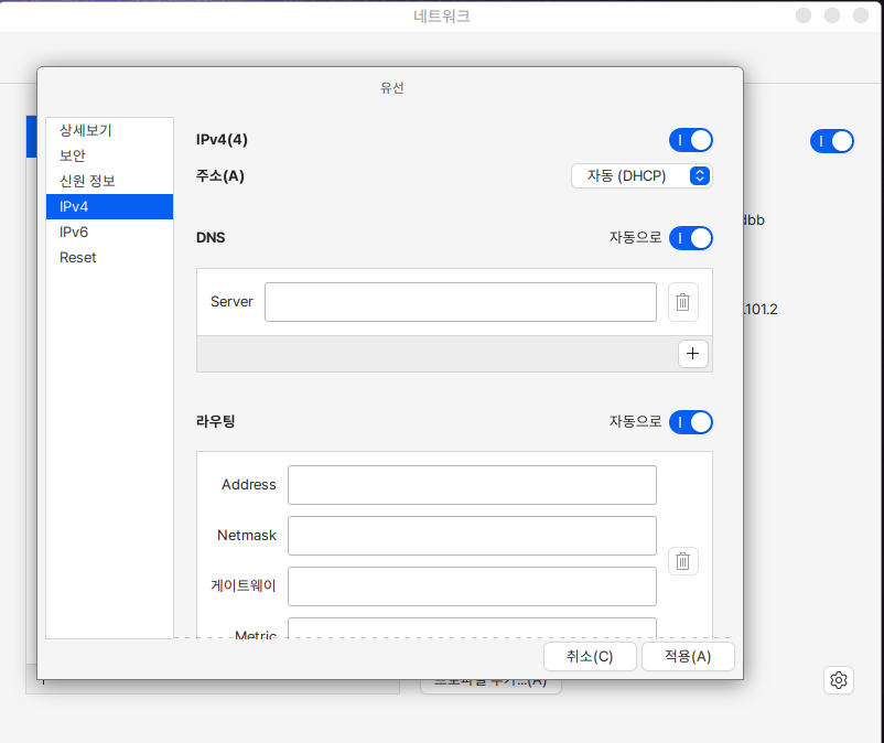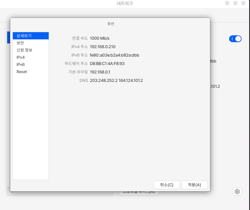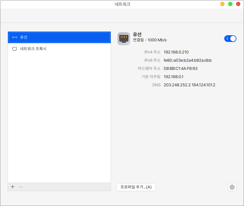 네트워크로 현재 연결되어 있는 IP의 상세정보나 무선인터넷을 확인하고, IP를 추가할 수 있습니다 &#x20;
