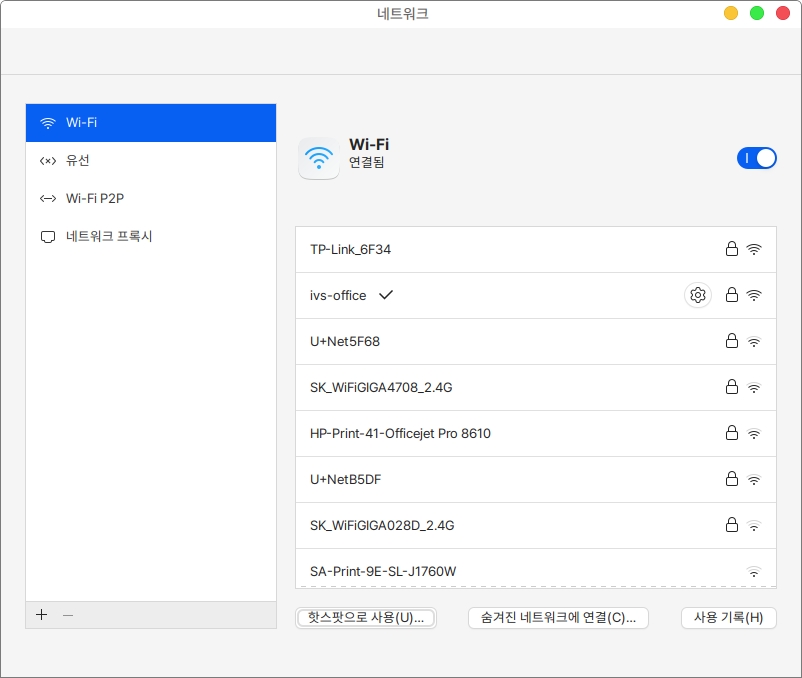 무선 인터넷을 연결하면 좌측 사이드바에 Wi-Fi 항목이 보여지고, 연결 가능한 와이파이 목록과 와이파이 사용기록을 확인할 수 있습니다.