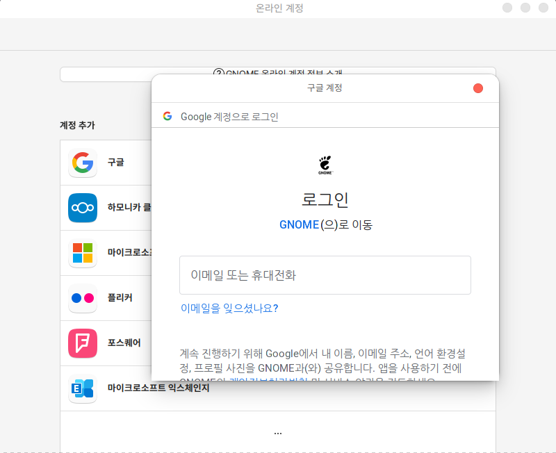 화면 상단의 GNOME온라인 계정 정보 소개를 클릭하면 도움말 확인이 가능합니다.&#x20;
