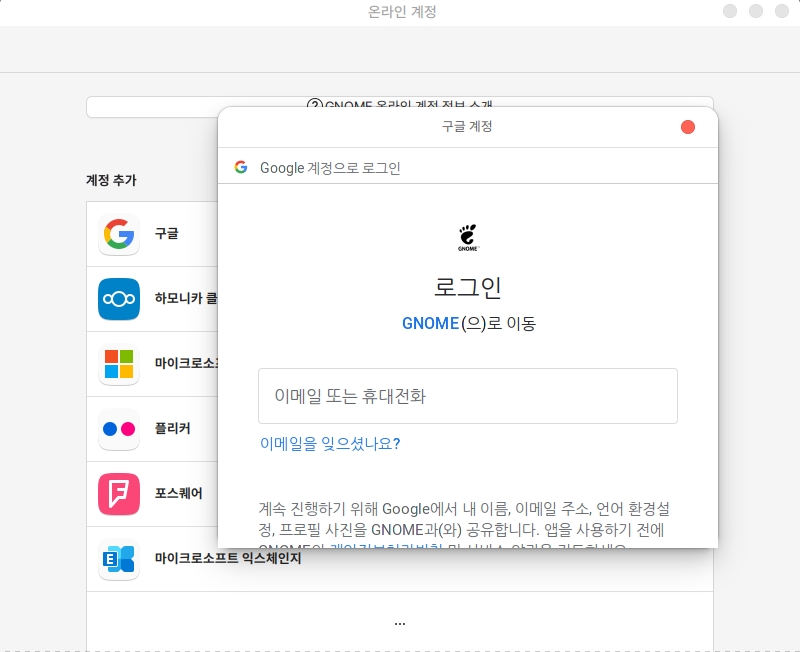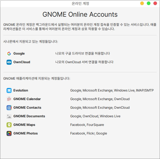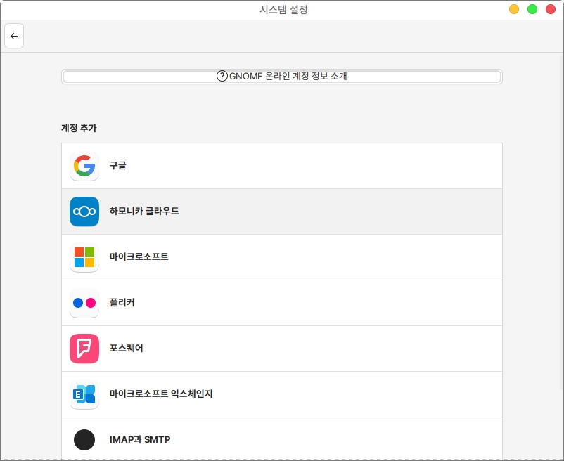 화면 상단의 GNOME온라인 계정 정보 소개를 클릭하면 도움말 확인이 가능합니다.
