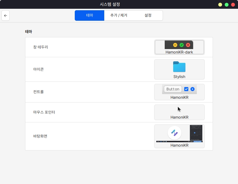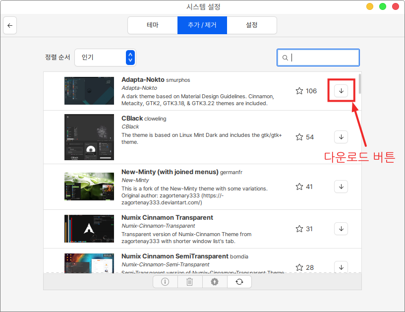 추가 / 제거 매뉴에서는 기존에 있는 테마 뿐만 아니라 다양한 테마를 다운로드 받을 수 있습니다.