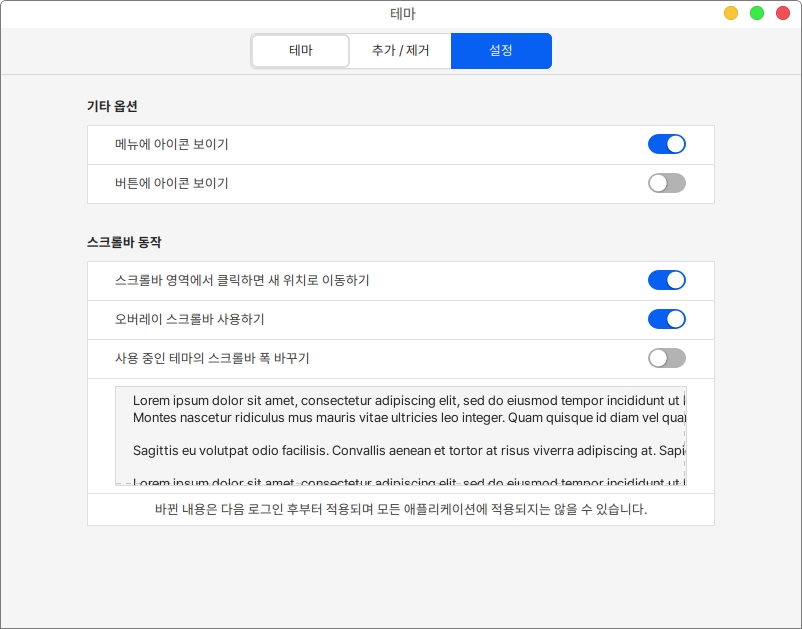 2. 태마 매뉴에서 각각의 항목을 클릭해보면 다운로드 받은 테마가 추가된 것을 확인할 수 있습니다.