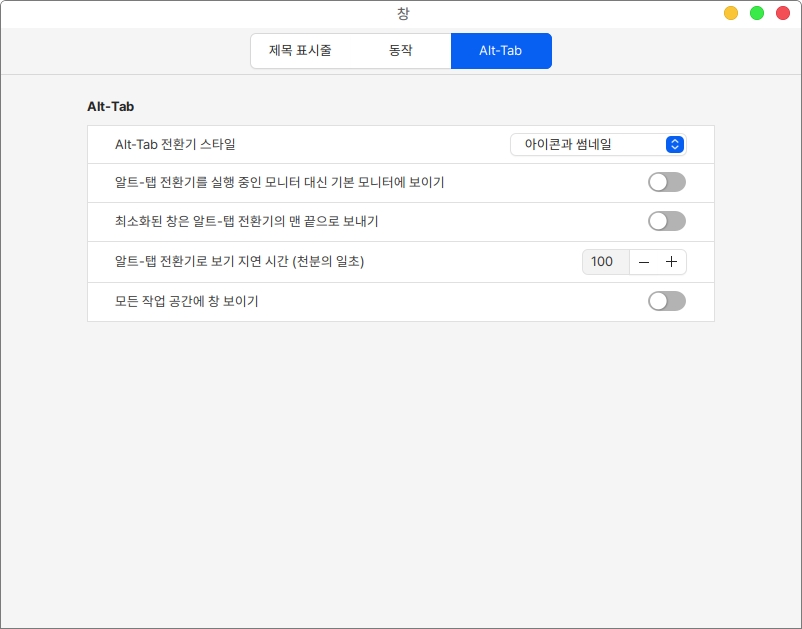 Alt-Tab 항목에서는 단축키 Alt-Tab을 눌렀을 때 동작되는 기능에 대한 설정을 할 수 있습니다.