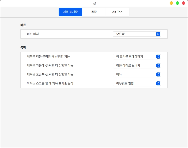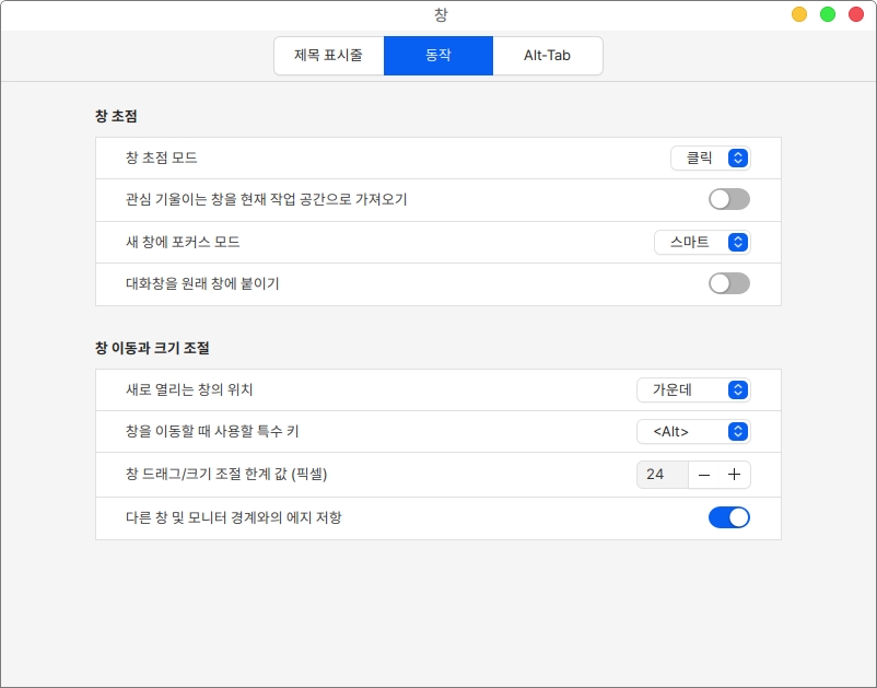 동작 항목에서는 창 초점 설정과 창 이동과 크기 조절에 대한 설정이 가능합니다.