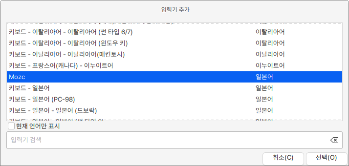 4. 설정 화면에서 하단의 + 버튼을 누르면 설치 가능한 언어 목록이 보여집니다. 현재 언어만 표시의 체크 표시를 해제한 후 설치한 언어를 찾아 선택을 눌러줍니다.