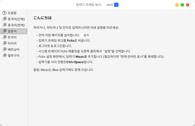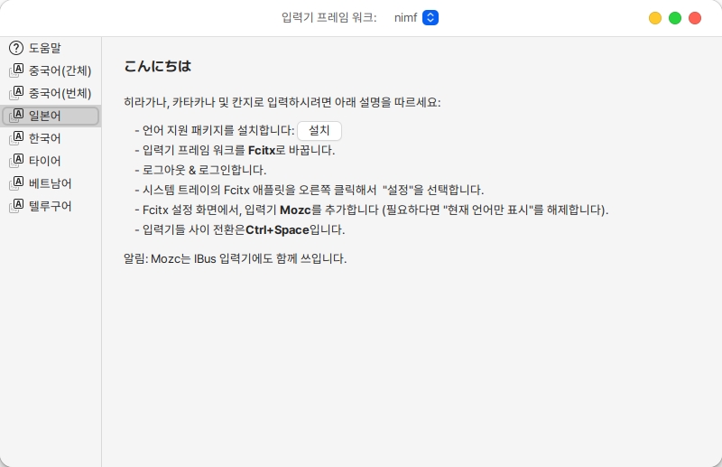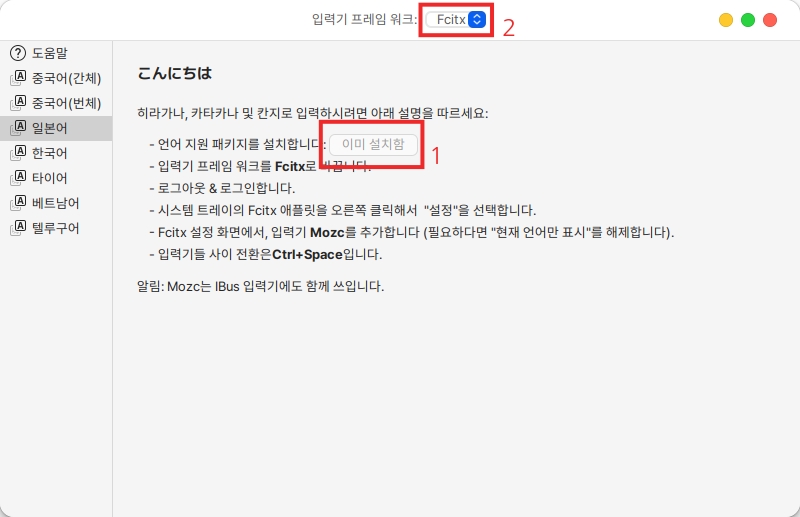 2. 언어 지원 패키지를 설치하고 입력기 프레임 워크를 Fcitx로 바꿔준 후, 로그아웃 로그인합니다.