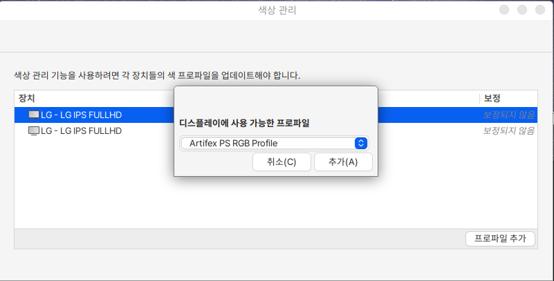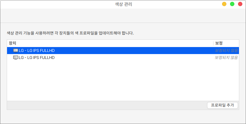 색상 관리 기본 화면에는 연결된 장치 목록이 보여집니다.&#x20;