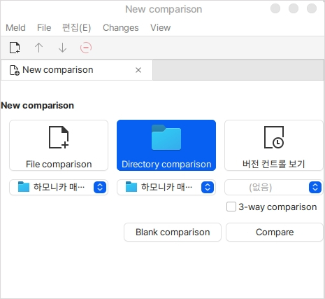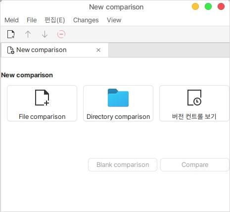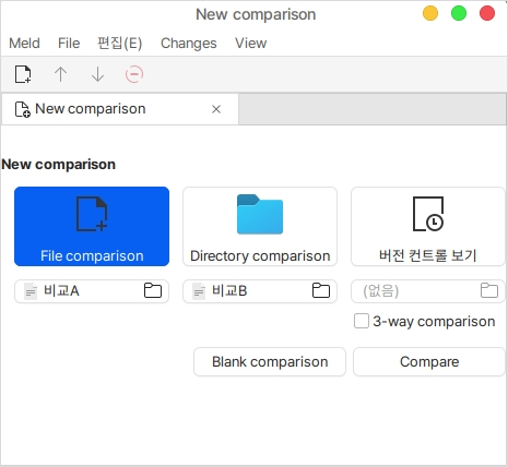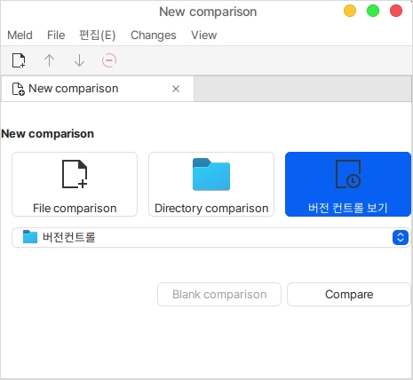 실행하면 다음과 같이 **파일 비교**(File comparison), **디렉터리 비교**(Directory comparison), **버전 컨트롤 보기**로 분류되어 있습니다.