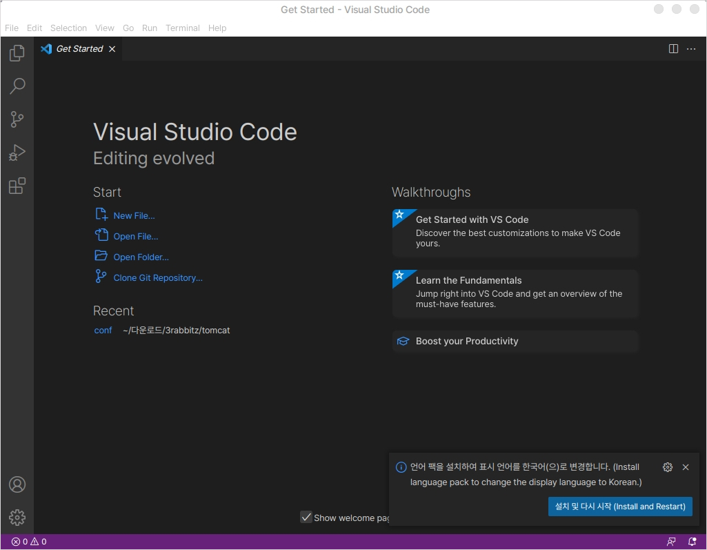 우측 하단의 알림으로 올라오는 한국어 언어팩을 설치를 하게 되면 인터페이스가 전부 한국어로 바뀌게 됩니다.