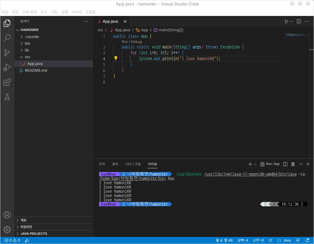 자바 프로그램이 잘 실행되는지 확인합니다.