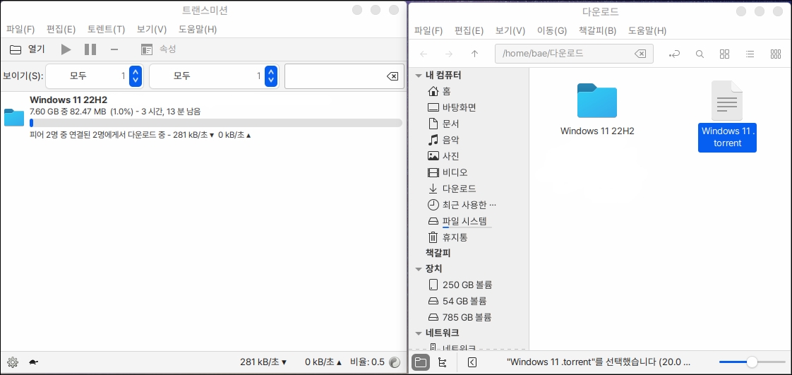 토렌트 파일을 끌어다가 토렌트 클라이언트 창에 끌어다 놓으면 다운로드가 시작됩니다.