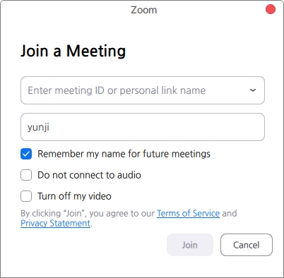 Join a Meeting 버튼을 누르면 회의 ID나 링크를 입력할 수 있고, 회의에서 사용할 이름을 설정이 가능합니다.