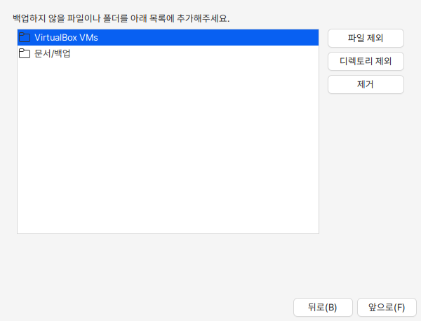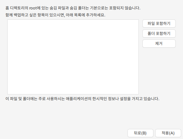 홈 디렉토리의 root에 있는 숨김 파일과 폴더는 백업에 포함되지 않으로 추가로 백업하고 싶은 항목이 있으면 추가합니다.&#x20;