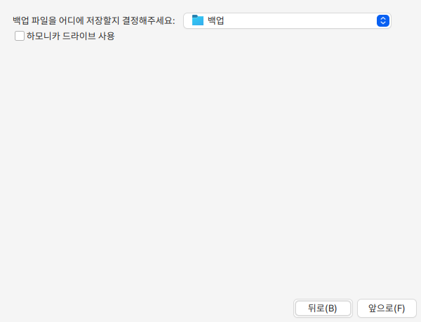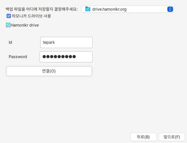 하모니카 드라이브 사용에 체크를 하고 하모니카 드라이브의 계정 정보를 입력하여 연결하면 하모니카 드라이브가 바탕화면에 마운트 되며 드라이브로 백업 파일을 저장할 수 있습니다.&#x20;