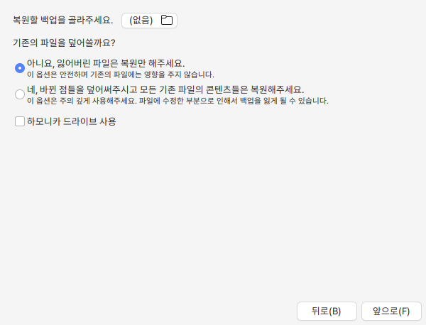 개인자료의 복원은 완전 덮어쓰거나 잃어버린 파일만 복구할 수 있습니다. 로컬PC에 저장이 되었거나 하모니카 드라이브에 저장된 백업파일을 선택할 수 있습니다.&#x20;