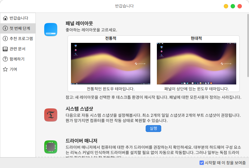 바탕화면 레이아웃 설정, 시스템 스냅샷, 드라이버/업데이트 매니저, 시스템 설정, 소프트웨어 매니저 등 바로가기 를 제공합니다.&#x20;