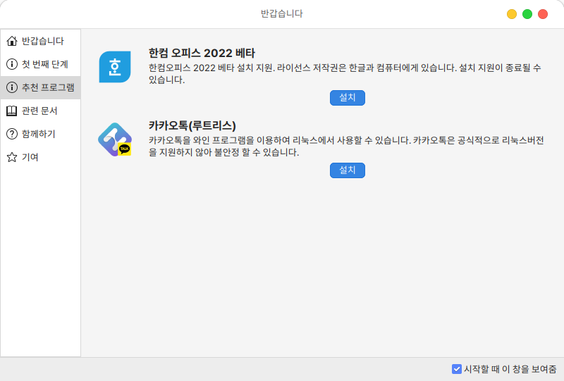 추천 프로그램에서는 한글문서 편집을 위한 한컴 오피스 2022 베타, 카카오톡 설치를 제공합니다.