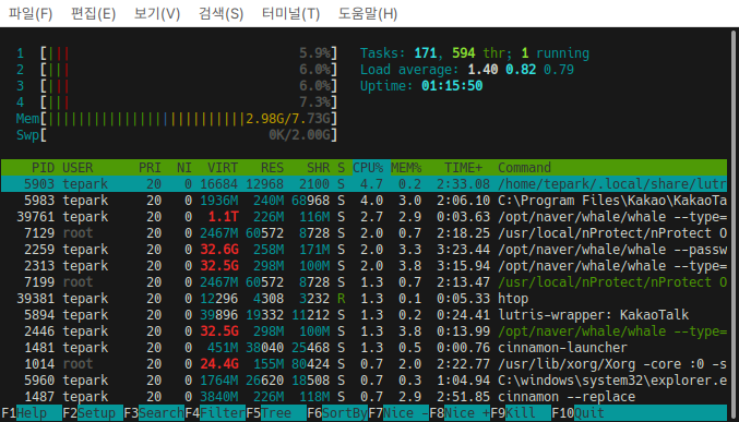 Htop은 실시간으 시스템 자원사용과 프로세스의 상태를 확인할 수 있습니다.&#x20;