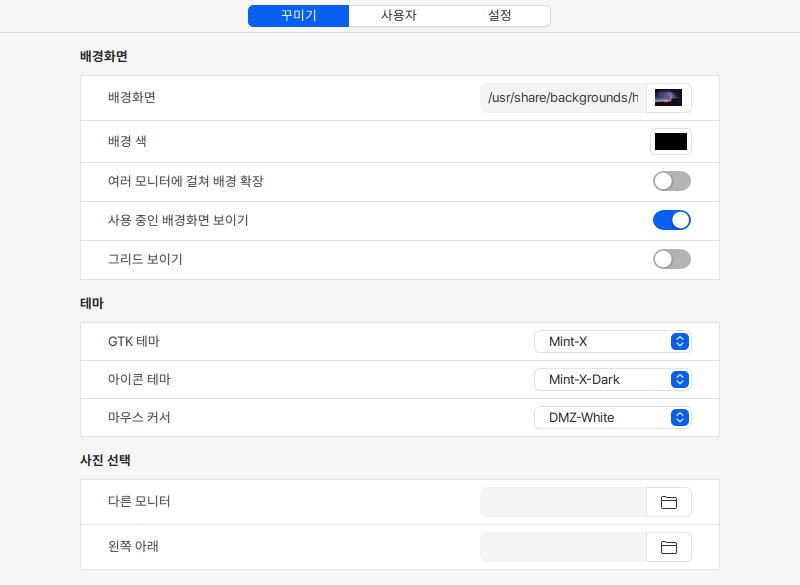꾸미기 탭에서 로그인 화면을 사용자가 원하는데로 수정할 수 있습니다. 배경화면, 배경색과 로그인 화면의 테마를 변경할 수 있습니다.