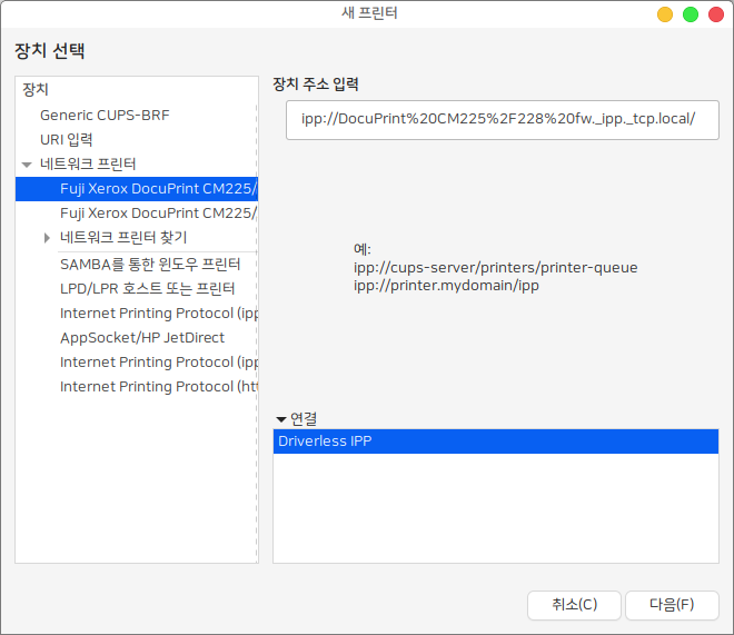 프린터 제조사에서 적합한 리눅스용 드라이버를 제공하지 않는 경우에는 Driveless 프린터를 추가할 수도 있습니다.