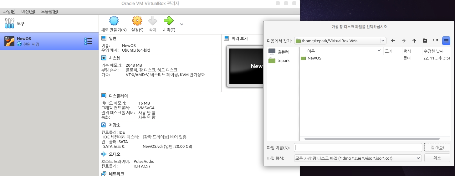 이제 '저장소' 메뉴에서 설치할 운영체제의 설치 파일(.iso 등)을 불러들여 설치를 시작합니다.