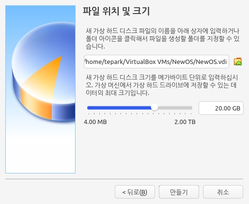 다음을 눌러 파일이 생성될 위치와 가상머신의 크기를 설정합니다.