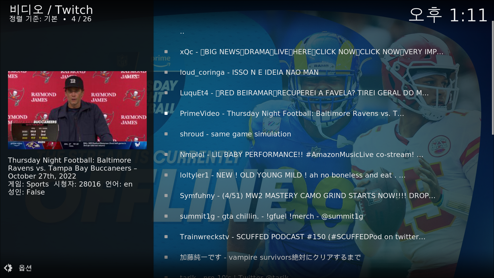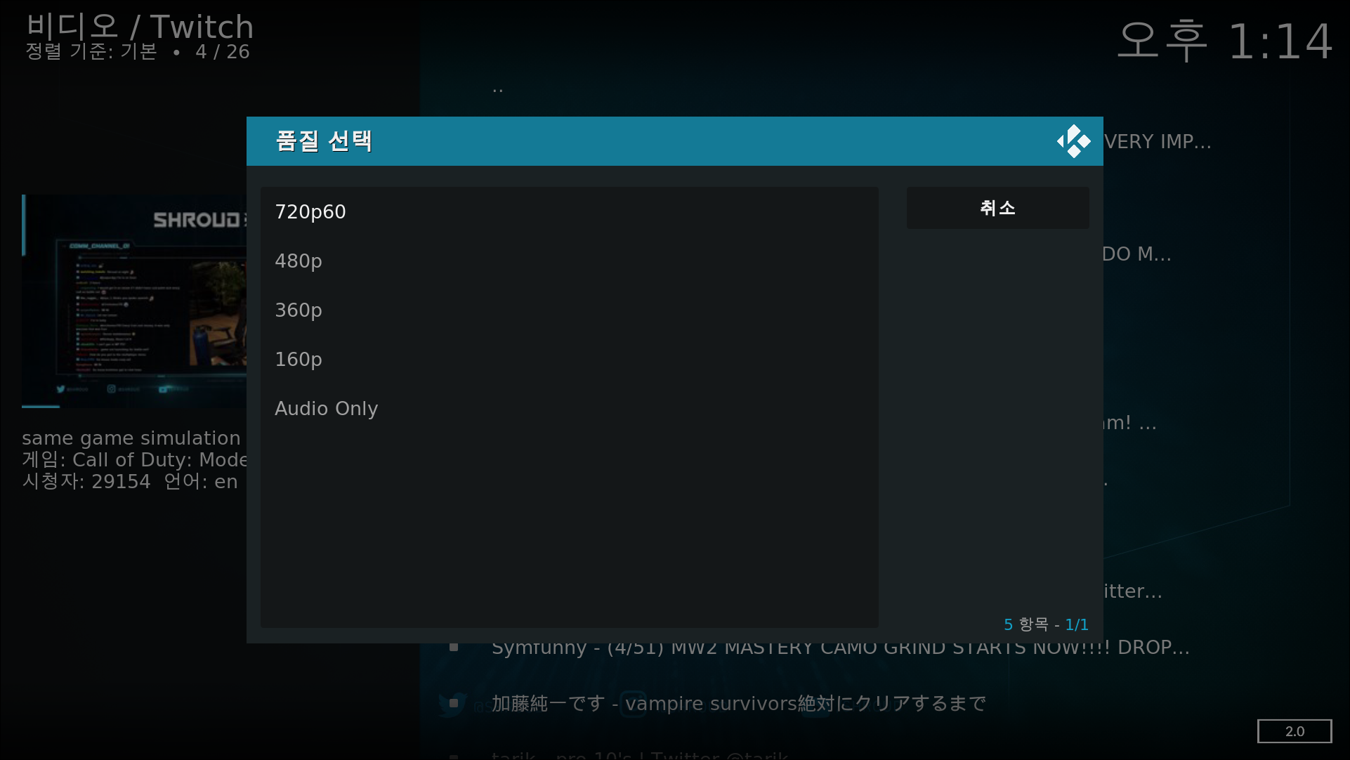 아쉽게도 최근 트위치가 한국에서는 망 사용료 문제로 인해 1080p 시청을 제거했기 때문에 코디에서도 720p 까지만 시청하실 수 있습니다.