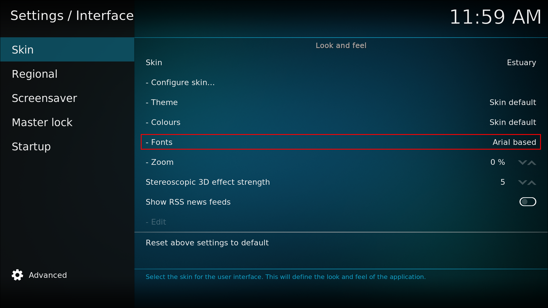 먼저 첫번째 항목인 스킨(Skin) 탭에서 Fonts를 Arial based로 변경합니다.