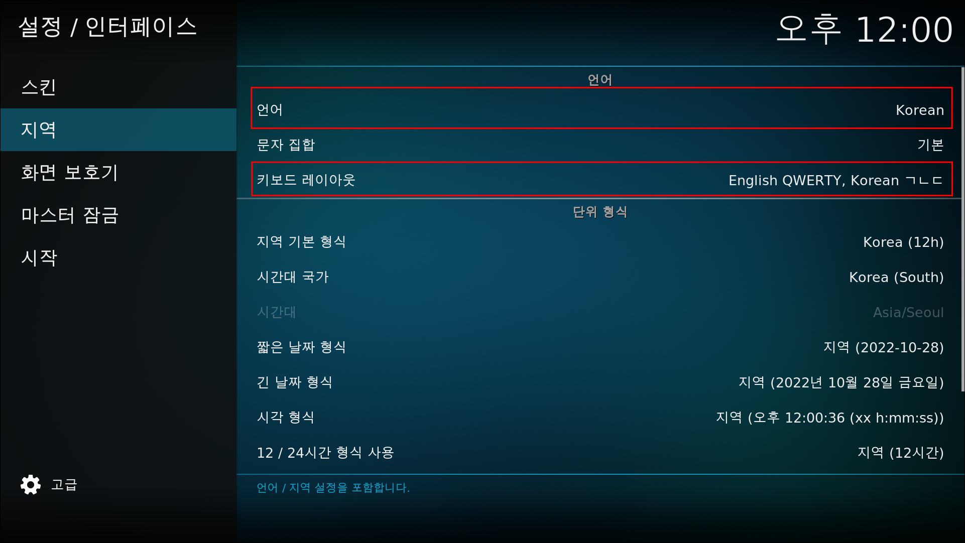 두번째 탭인 지역(Regional)로 이동하 언어(Language) 항목을 Korean으로 변경합니다.